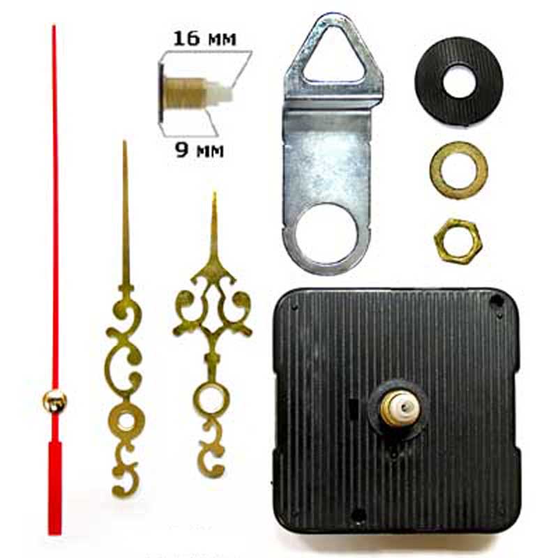 Комплект: бесшумный механизм (360 имп/мин, шток 16/9 мм), 3 стрелки (минутная 68 мм от оси, часовая 50 мм), гайка с шайбой и прокладкой, металлическая петля