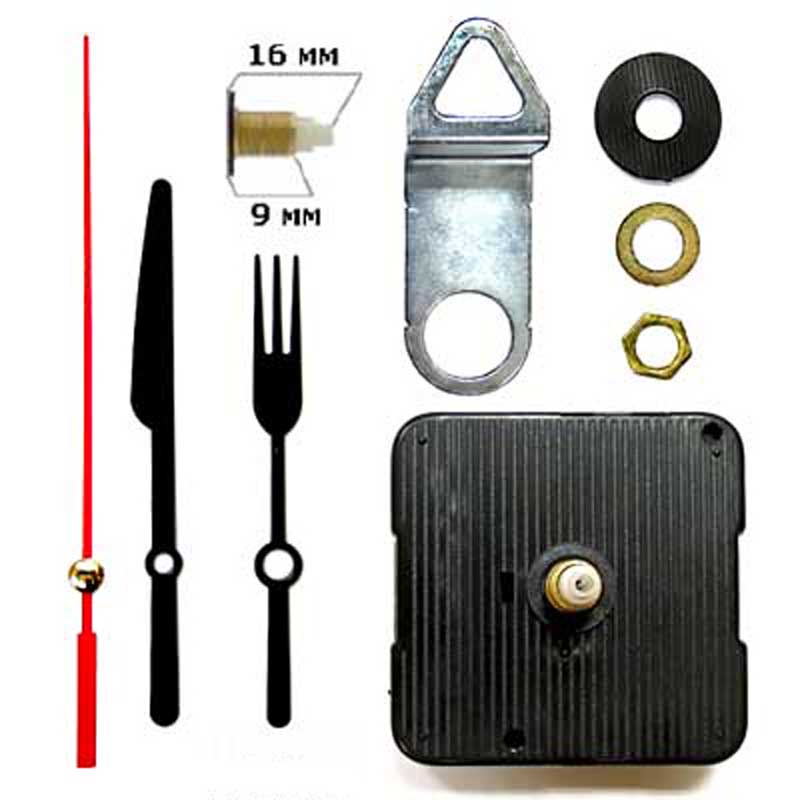 Комплект: бесшумный механизм (360 имп/мин, шток 16/9 мм), 3 стрелки (минутная 71 мм от оси, часовая 58 мм), гайка с шайбой и прокладкой, металлическая петля