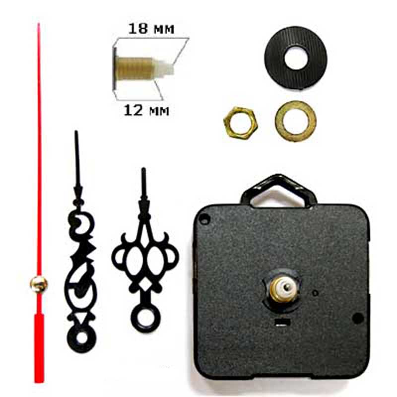 Комплект: бесшумный механизм (360 имп/мин, шток 18/12 мм), 3 стрелки (минутная 70 мм от оси, часовая 50 мм), гайка с шайбой и прокладкой