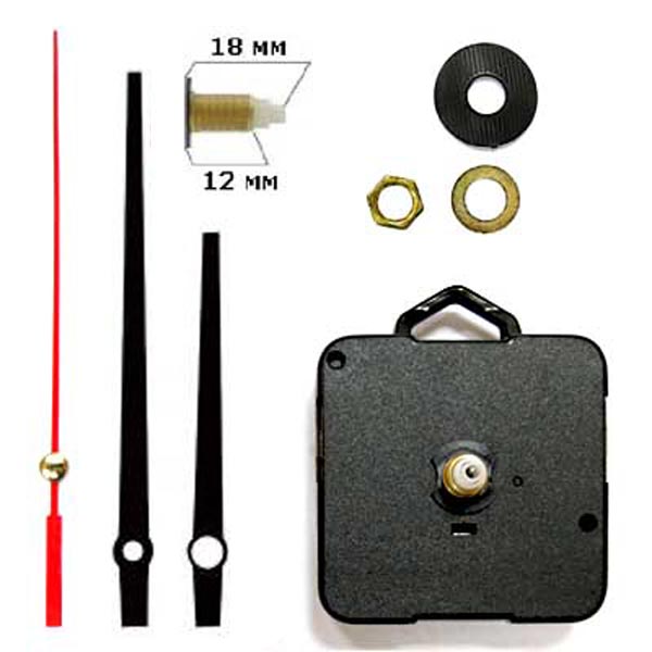 Комплект: бесшумный механизм (360 имп/мин, шток 18/12 мм), 3 стрелки (минутная 95 мм от оси, часовая 65 мм), гайка с шайбой и прокладкой