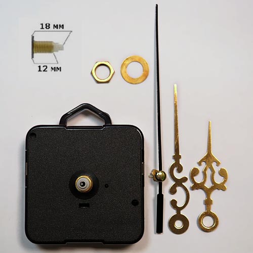 Комплект: бесшумный механизм (360 имп/мин, шток 18/12 мм), 3 стрелки (минутная 68 мм от оси, часовая 50 мм), гайка с шайбой и прокладкой