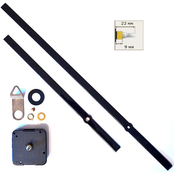 Комплект: бесшумный механизм (360 имп/мин, шток 22/9 мм), 2 стрелки (часовая 200 мм, минутная 300 мм), гайка с шайбой, металлическая петля. Для циферблатов диаметром до 1 метра.