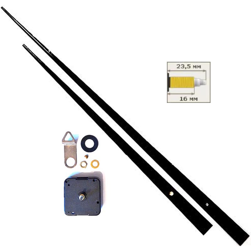 Комплект: бесшумный механизм (360 имп/мин, шток 23.5/16 мм), 2 стрелки (часовая 330 мм, минутная 450 мм от центра), гайка с шайбой, металлическая петля. Для циферблатов диаметром до 1 метра.