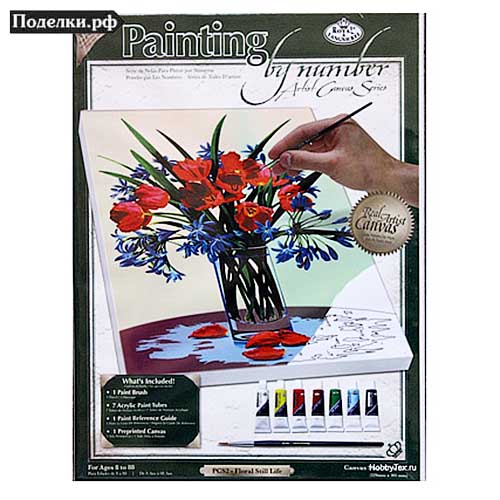 1 грунтованный холст с разметкой для рисунка, 10 акриловых красок в тубе по 5 мл, 1 кисть, палитра пластиковая