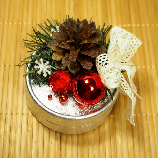 Коробочка картонная круглая серебряная с шишкой и бантиком TOV-0052 ручная работа 8х7 см
