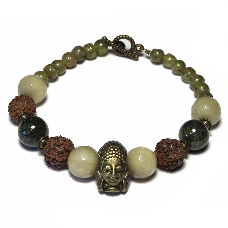 Браслет из натуральных камней (агат, змеевик, рудракша) TOV-0152 ручная работа, длина 20 см