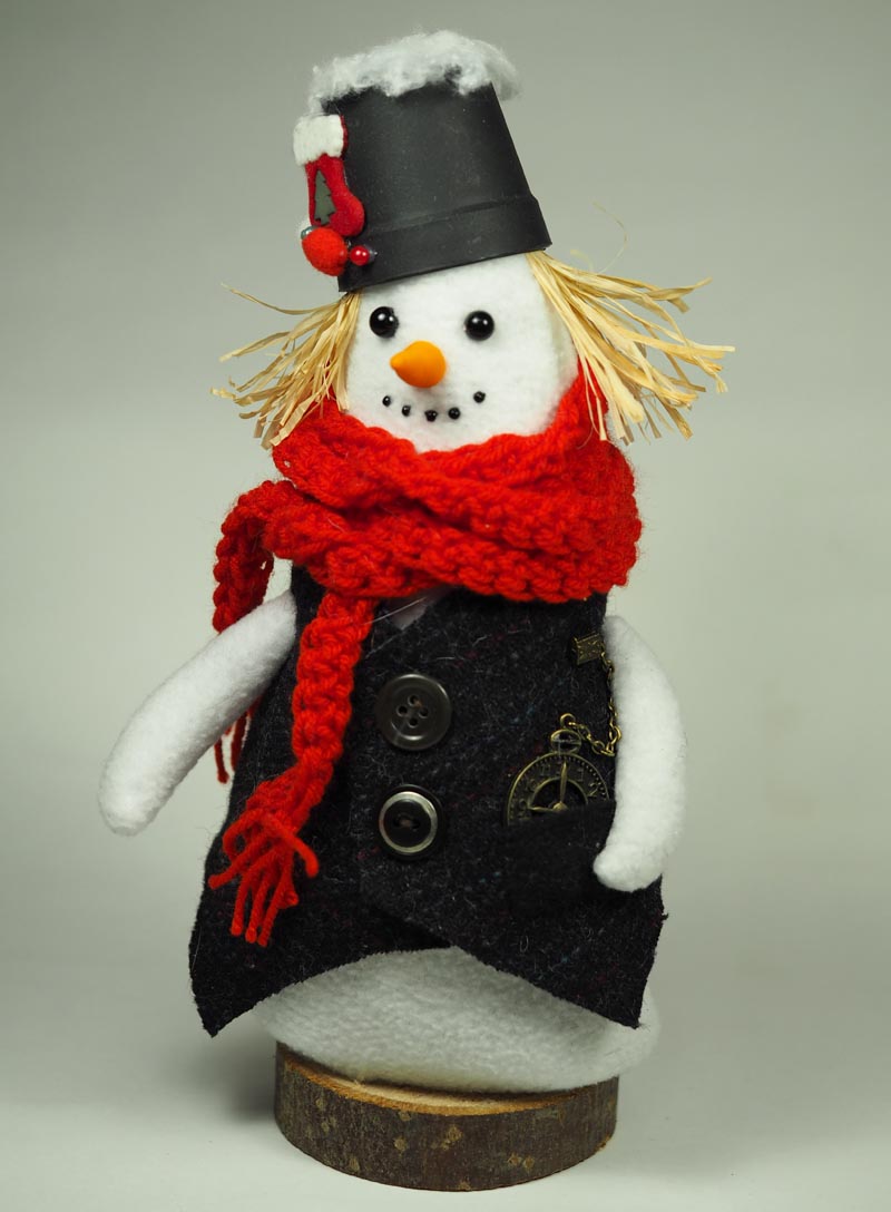 Снеговик в черном ведре с часами TOV-0221 ручная работа 23 см