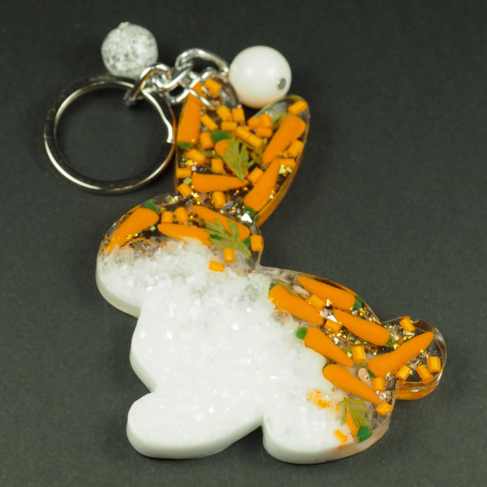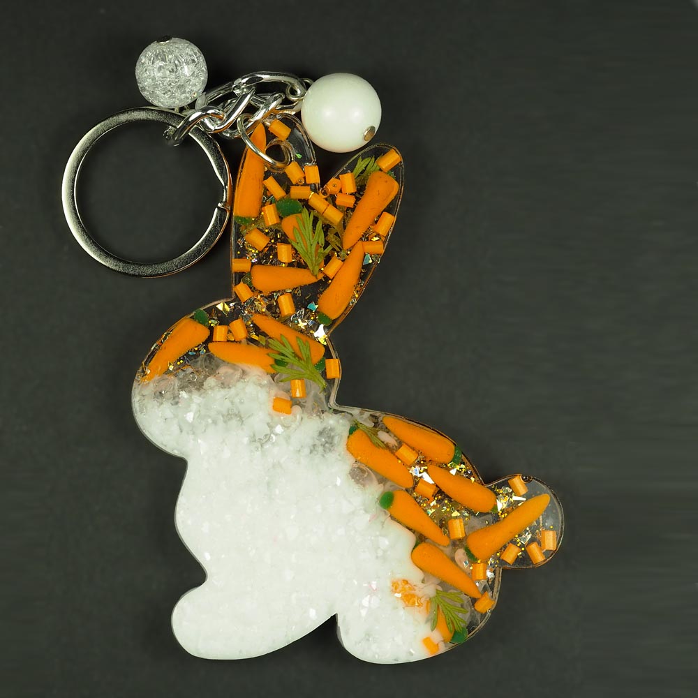 Брелок Заяц из эпоксидной смолы TOV-0313 белый цвет с оранжевыми морковками 80х65х6 мм