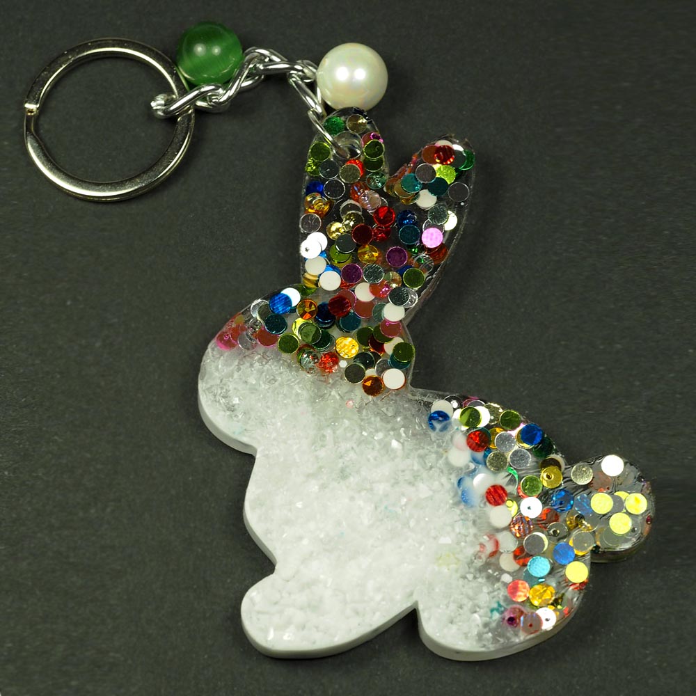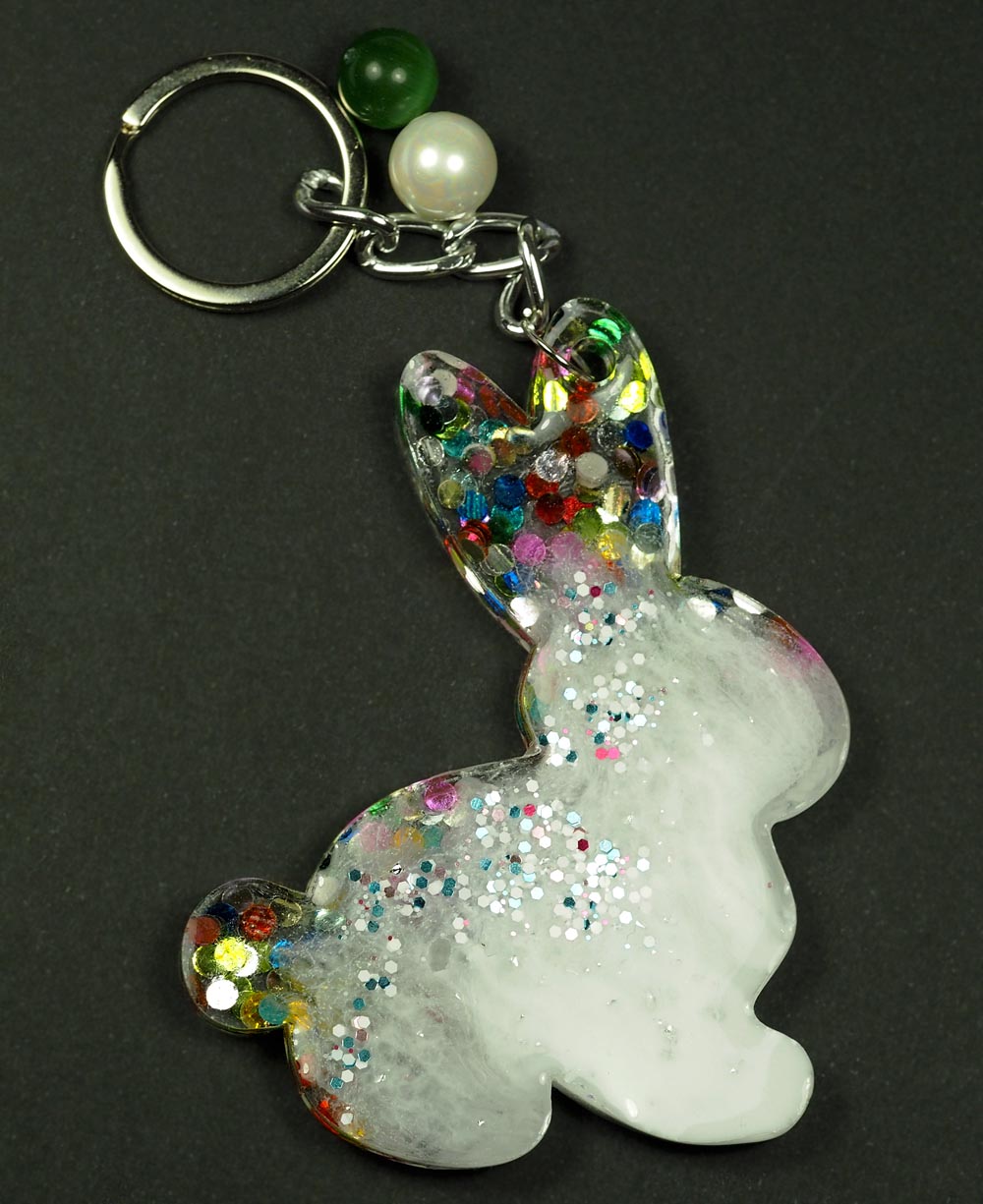 Брелок Заяц из эпоксидной смолы TOV-0321 белый цвет с разноцветным конфетти 80х65х6 мм