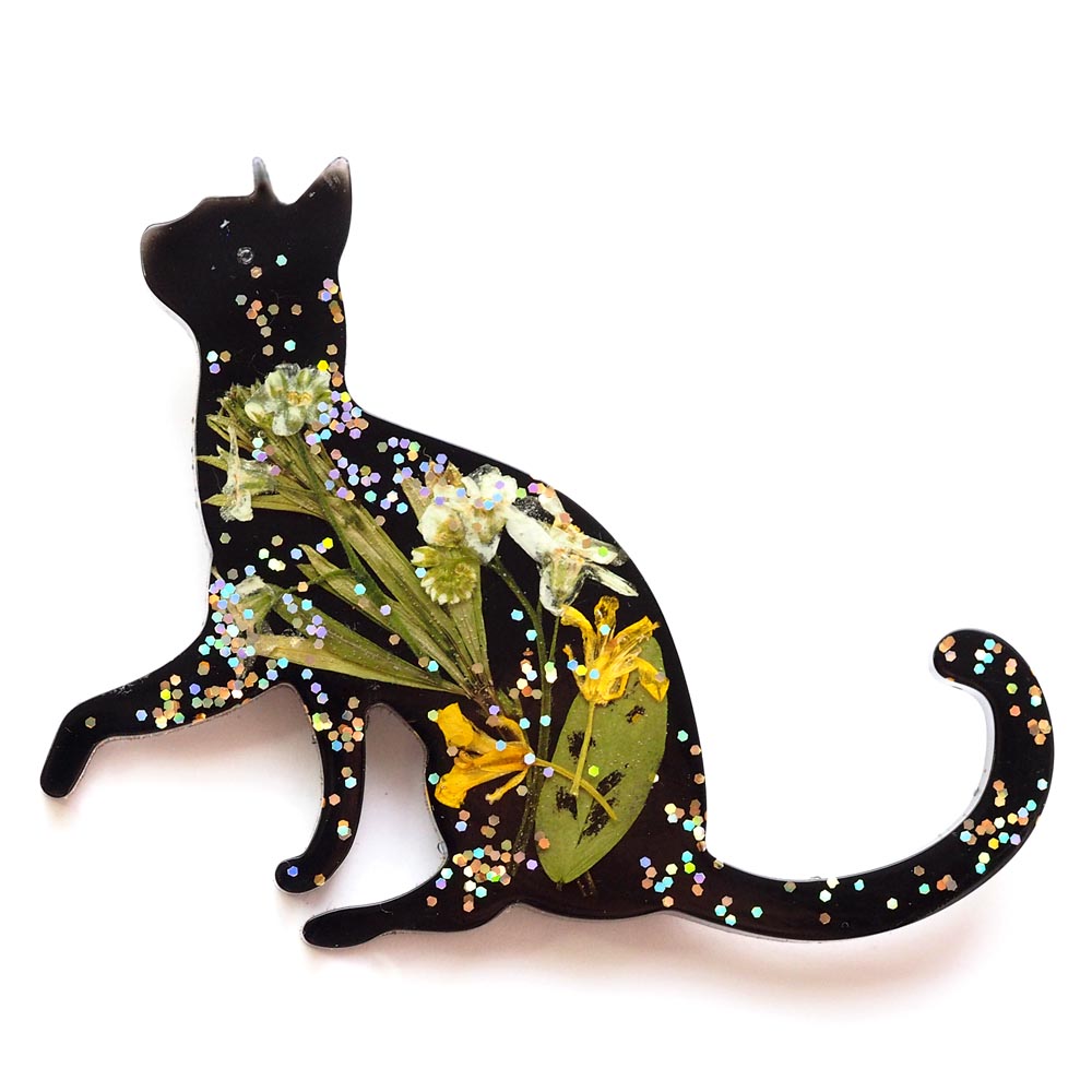 Брошь Кошка Игручая из эпоксидной смолы TOV-0327 черный цвет с натуральными сухоцветами и блестками 70х55х4 мм
