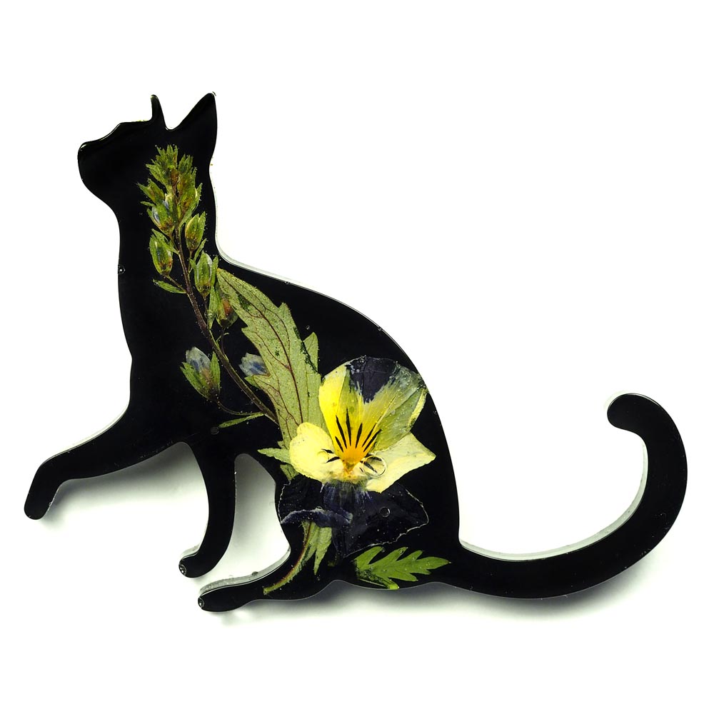 Брошь Кошка Игручая из эпоксидной смолы TOV-0328 черный цвет с натуральными сухоцветами Анютины Глазки 70х55х4 мм