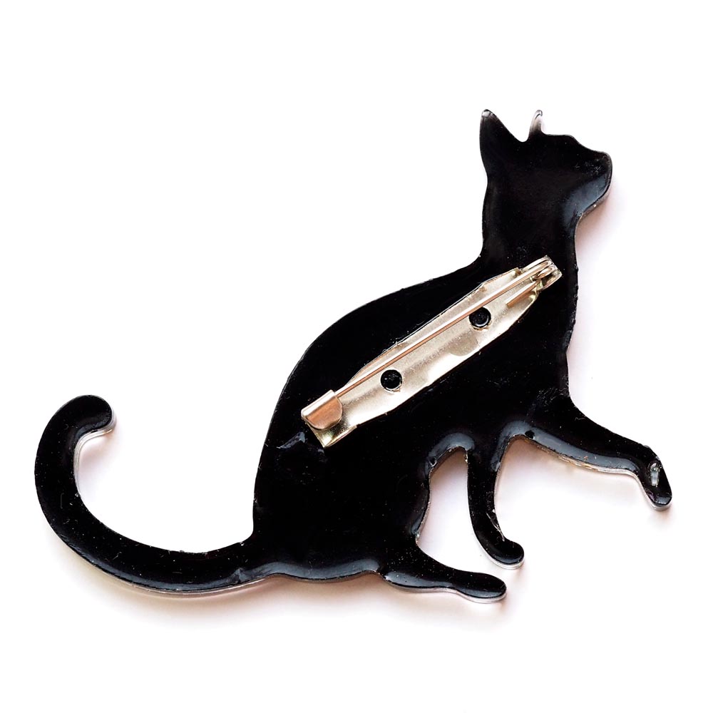 Брошь Кошка Сидящая из эпоксидной смолы TOV-0322 черный цвет с натуральными сухоцветами Лютики 80х65х4 мм