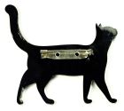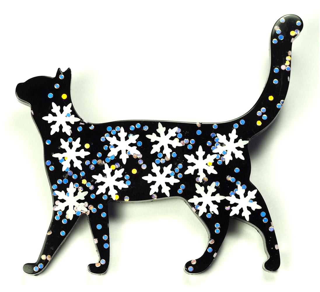 Брошь Кошка Стоящая из эпоксидной смолы TOV-0332 черный цвет с белыми снежинками и блестками 72х62х4 мм