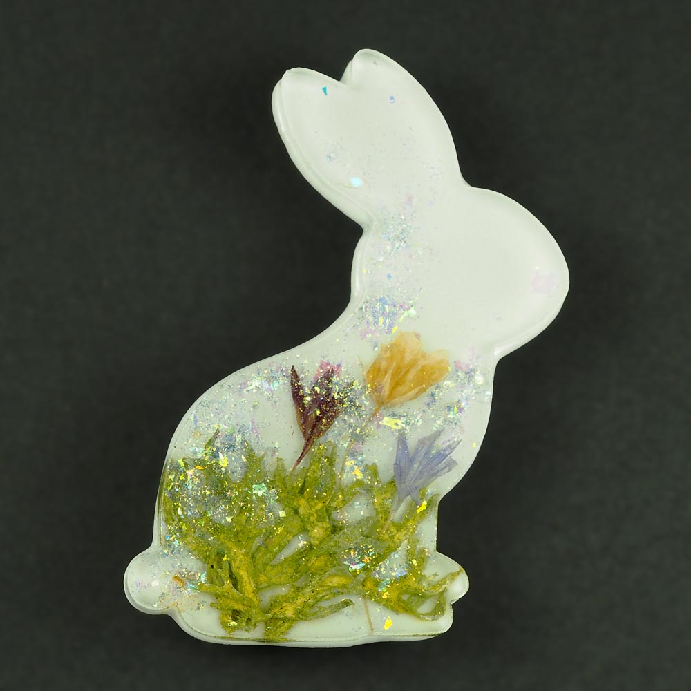 Брошь Зайчик из эпоксидной смолы TOV-0335 белый цвет с натуральными сухоцветами и блестками 54х40х6 мм