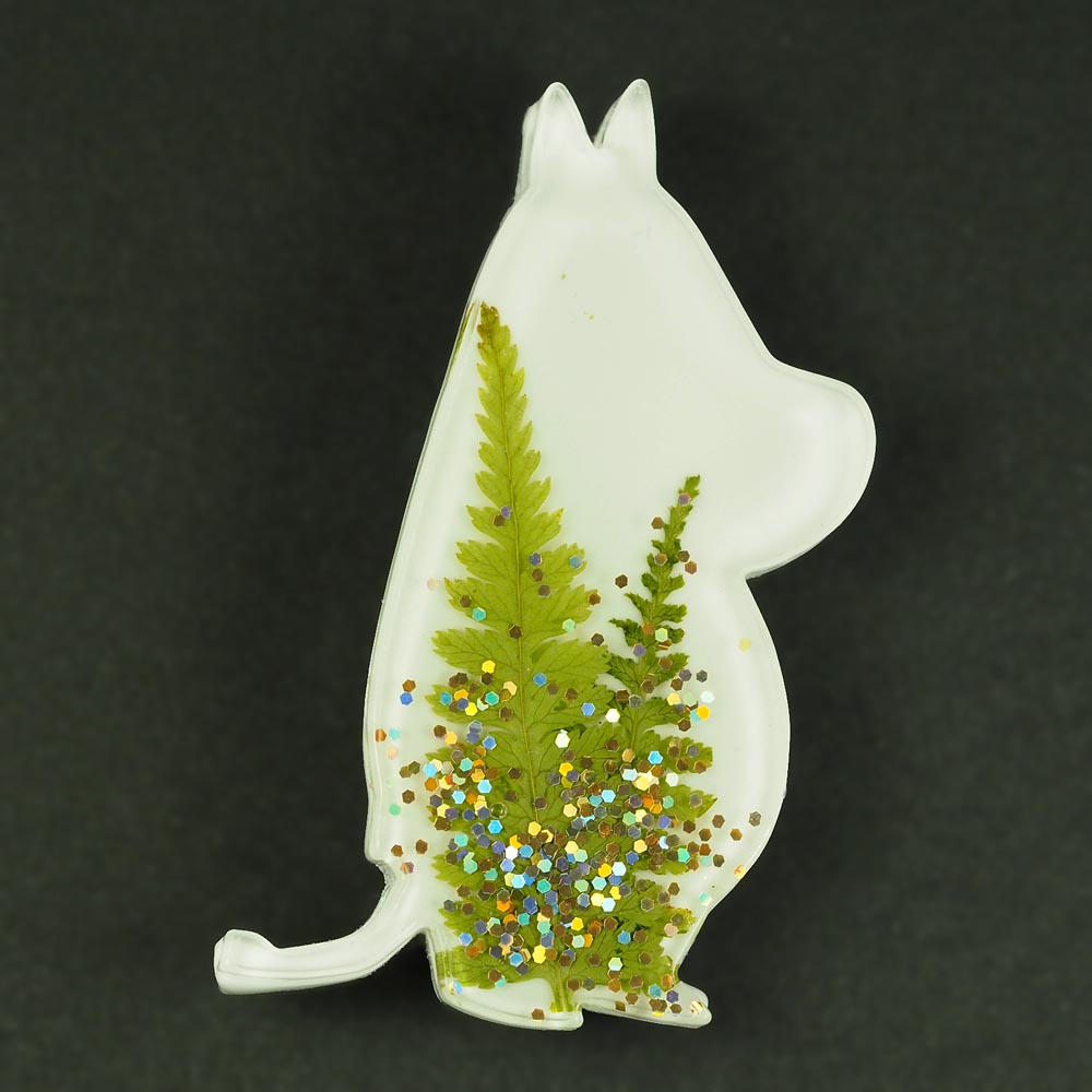 Брошь Муми-тролль из эпоксидной смолы TOV-0343 белый цвет с натуральными сухоцветами Папоротник и золотыми блестками 50х34х6 мм