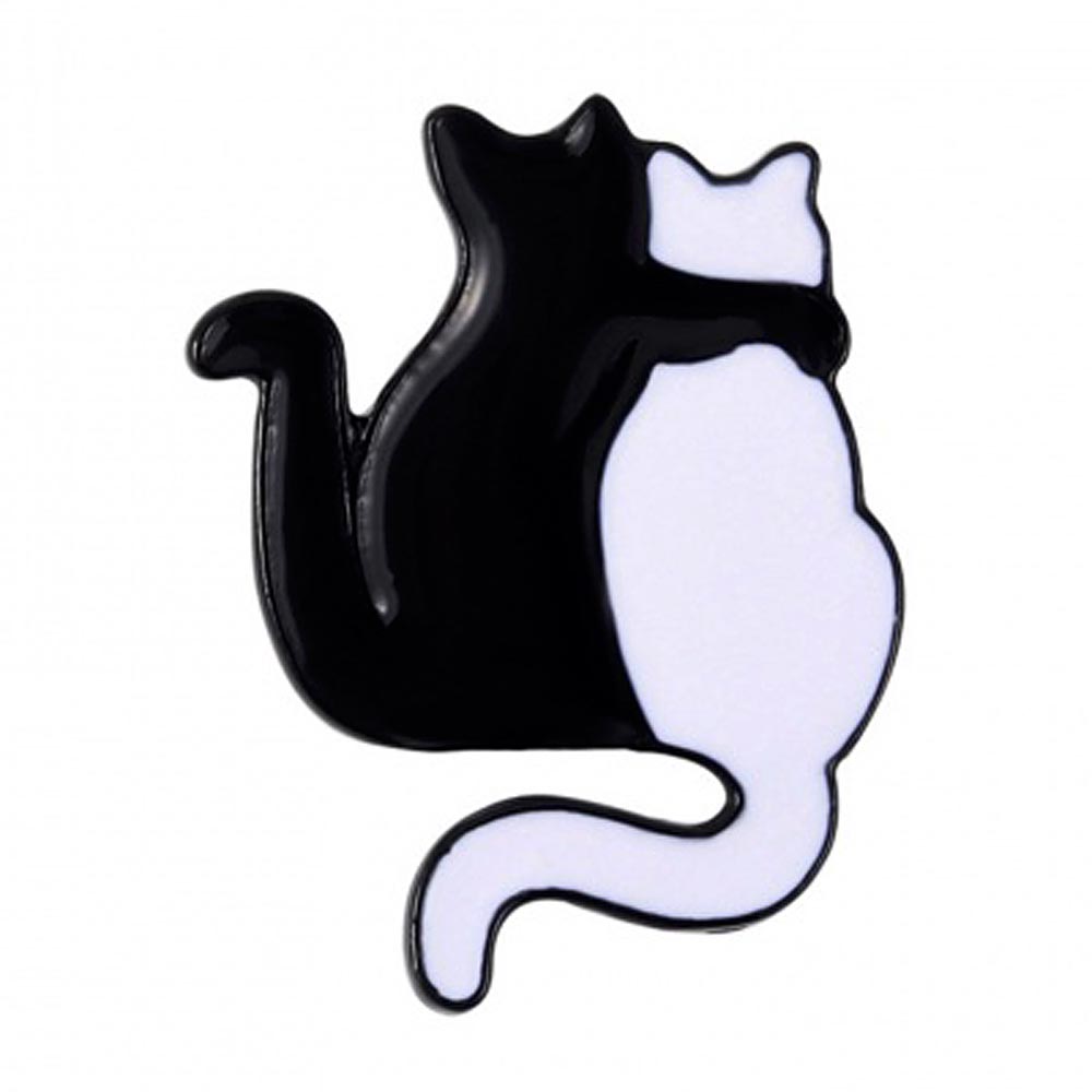 Брошь-значок металлическая Две кошки-обнимашки черная и белая эмаль TOV-0377 основа черного цвета с клипсой 28х19 мм