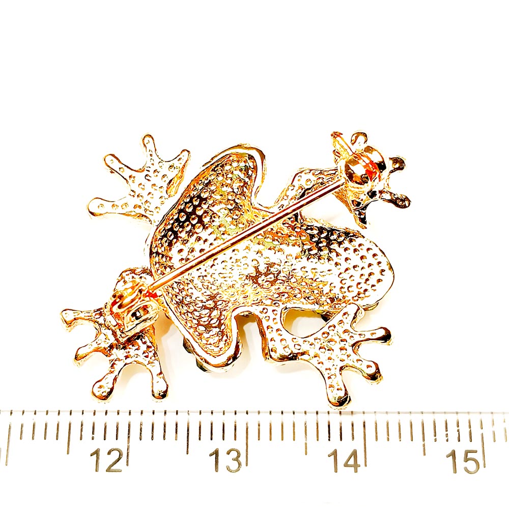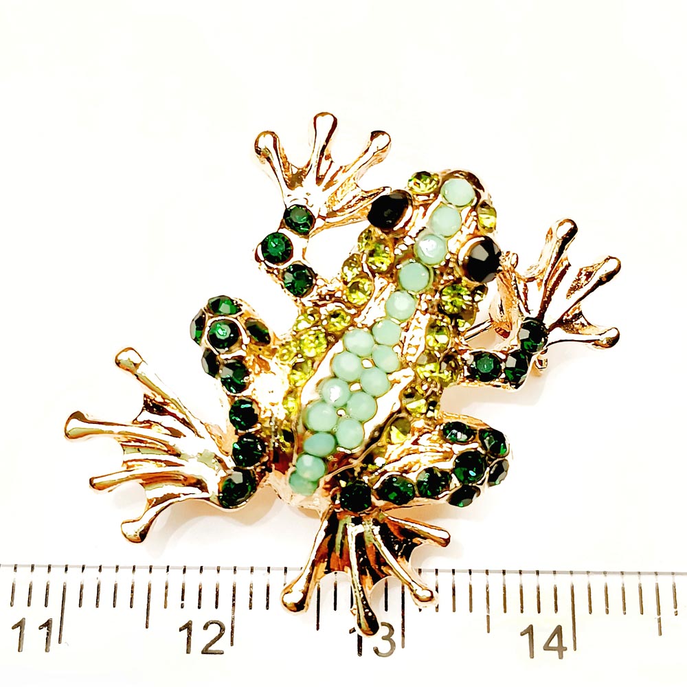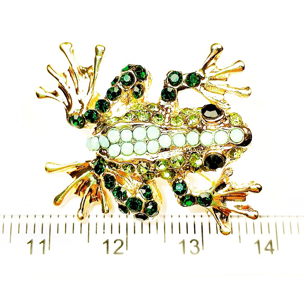 Брошь металлическая Лягушка с зелеными и белыми стразами TOV-0394 основа золотого цвета 27х22х7 мм