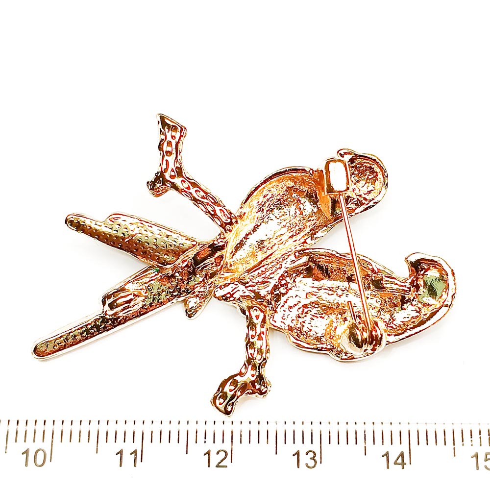 Брошь металлическая Лягушка с зелеными и розовыми стразами TOV-0393 основа золотого цвета 40х33х13 мм