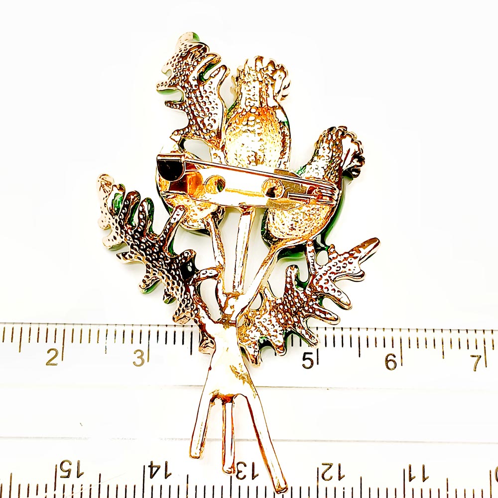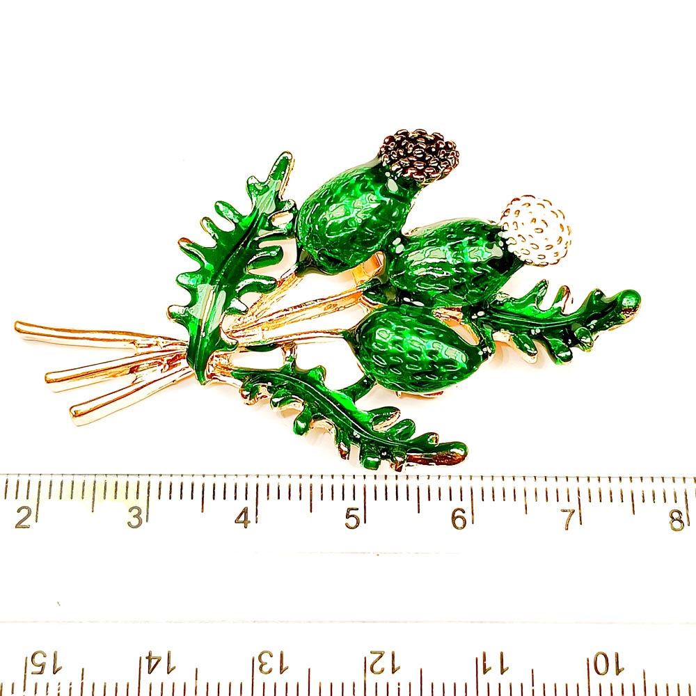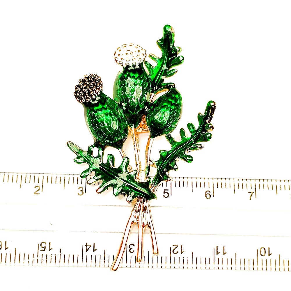 Брошь металлическая Букет чертоплоха с зеленой эмалью TOV-0405 основа золотого цвета 55х37х7 мм