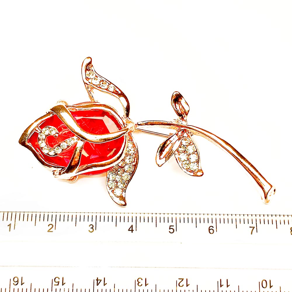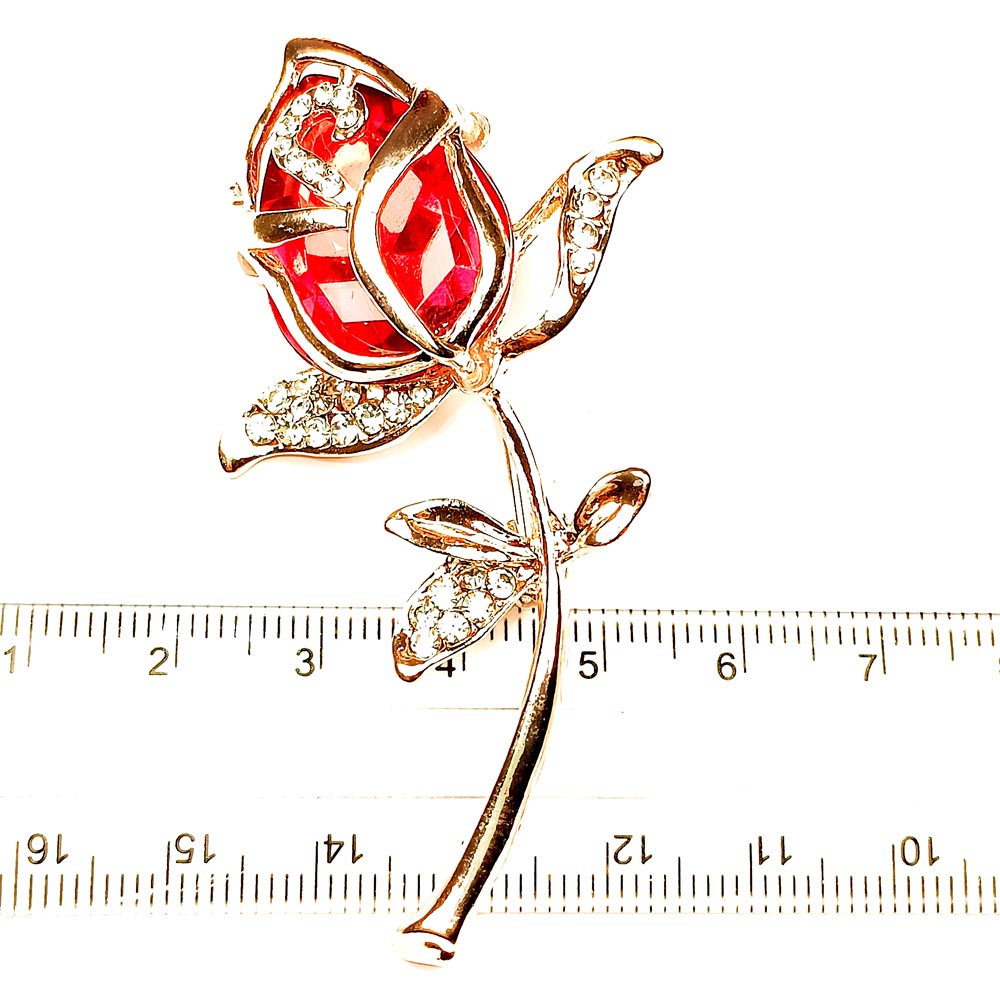 Брошь металлическая Роза с красным кристаллом и прозрачными стразами TOV-0407 основа золотого цвета 65х37х10 мм