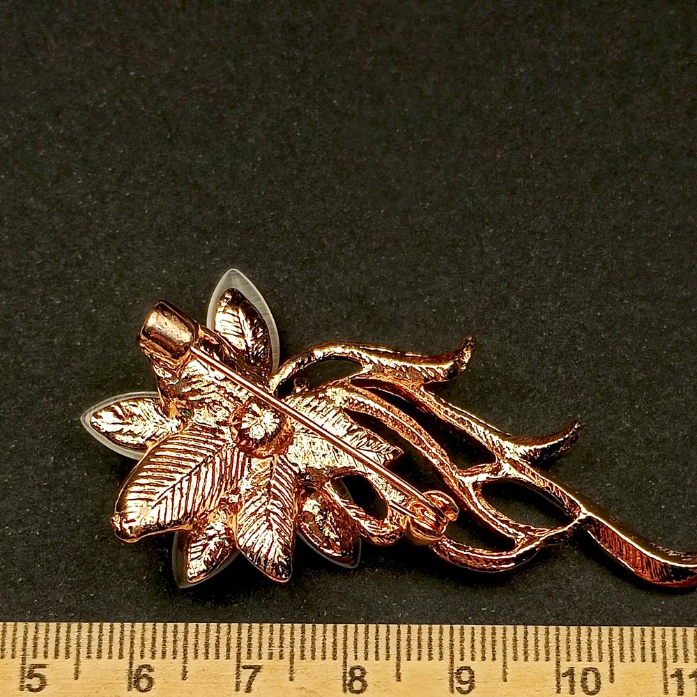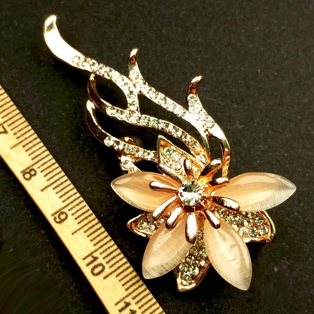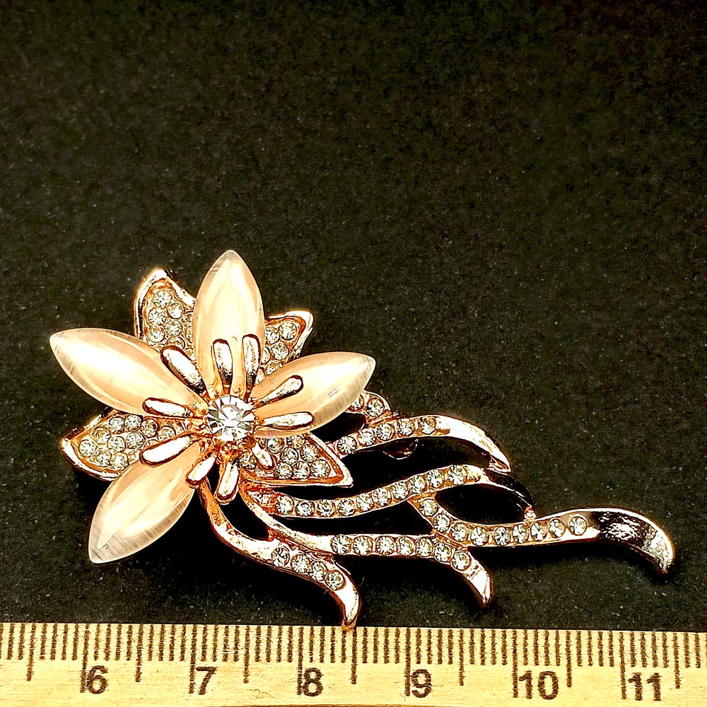 Брошь металлическая Цветок с прозрачными стразами и розовыми кристаллами TOV-0412 основа золотого цвета 64х30х17 мм