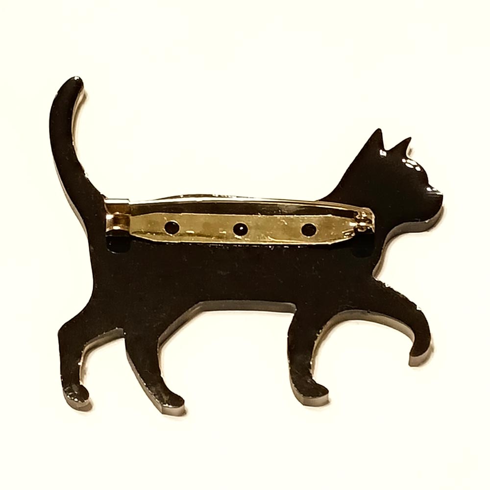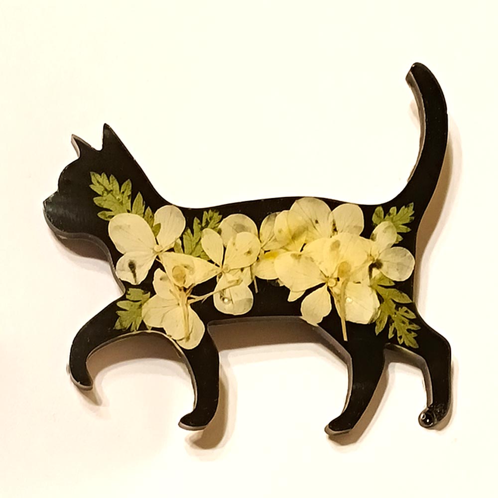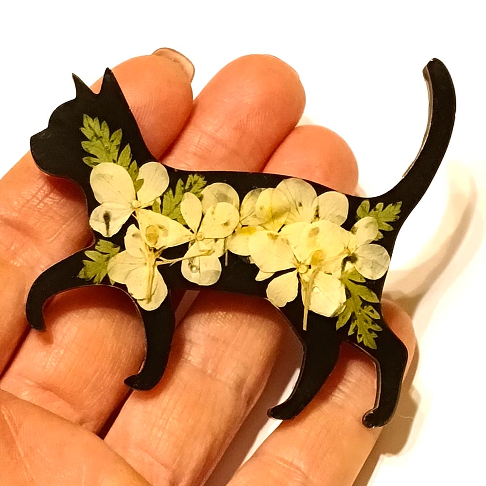 Брошь Кошка Стоящая из эпоксидной смолы TOV-0430 черный цвет с натуральными сухоцветами гортензии 72х62х4 мм