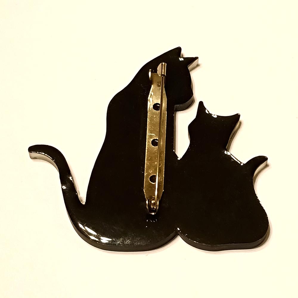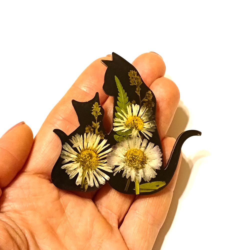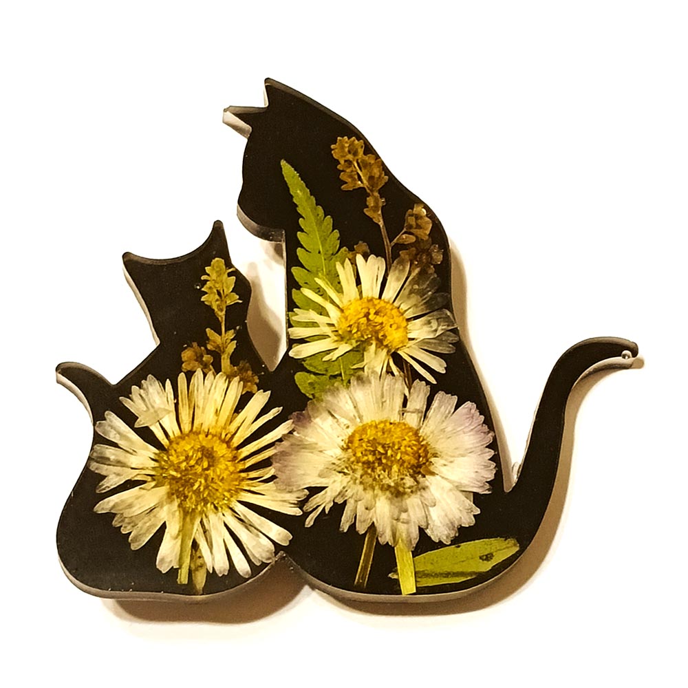 Брошь Две Кошки из эпоксидной смолы TOV-0437 черный цвет с натуральными сухоцветами Маргаритки и папоротник 66х67х4 мм