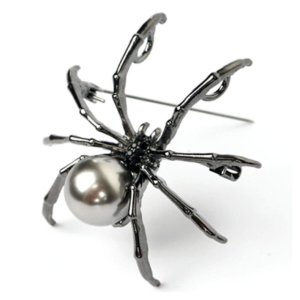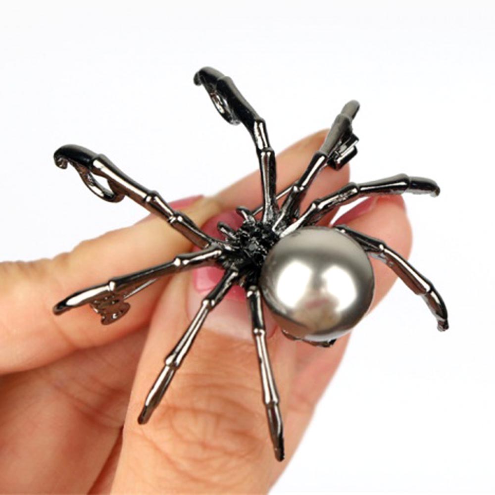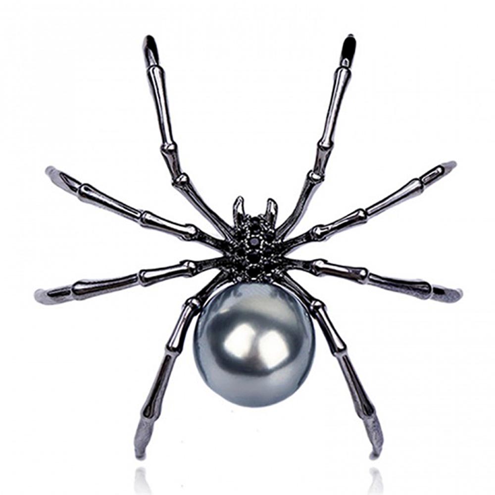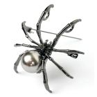 Брошь металлическая Паук с бусиной под Жемчуг и черными стразами TOV-0449 основа темно-серебряного цвета 50х45х15 мм