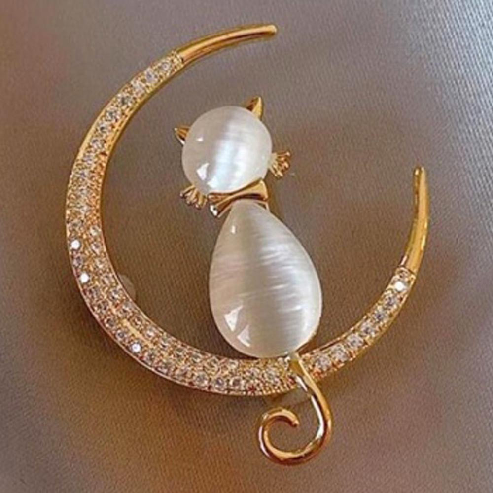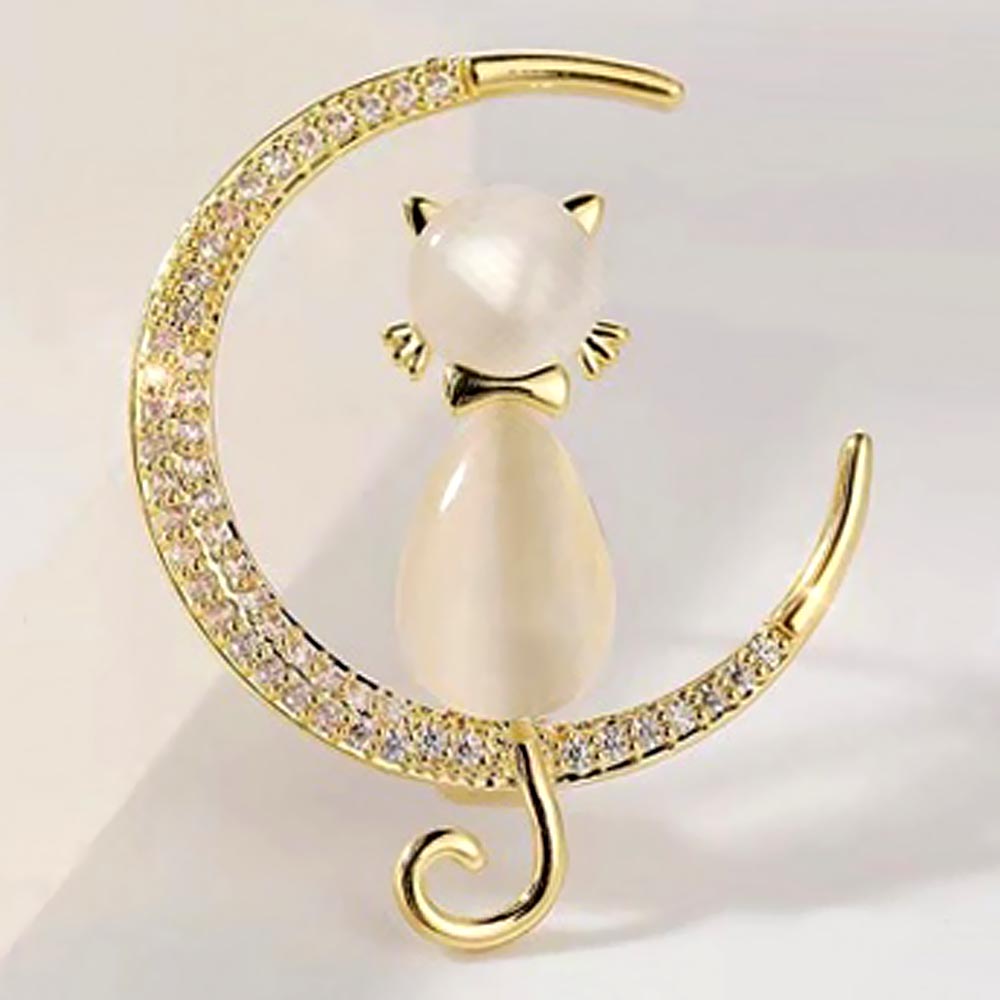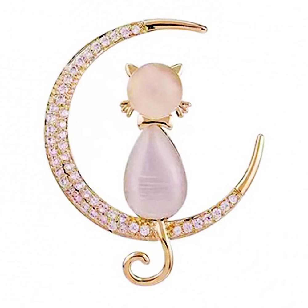 Брошь Кошка на Луне со стразами и бусинами под кошачий глаз TOV-0451 основа золотого цвета 38х30х7 мм