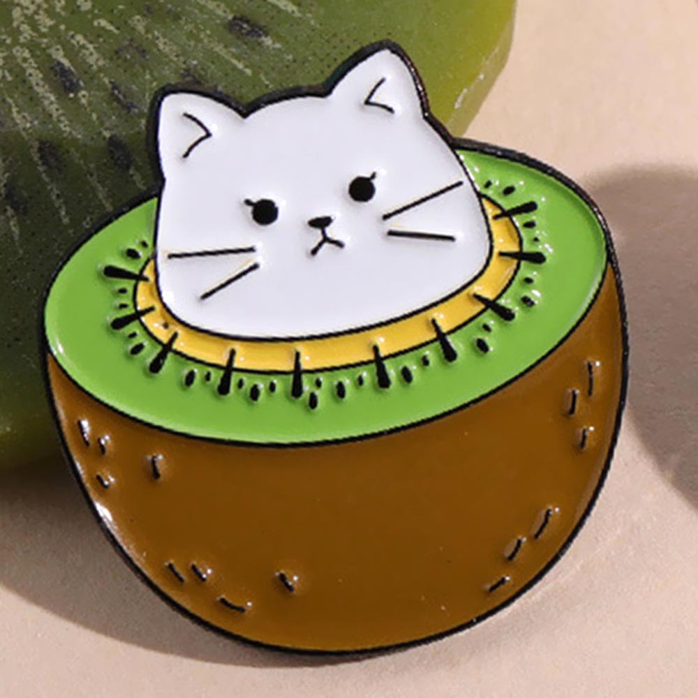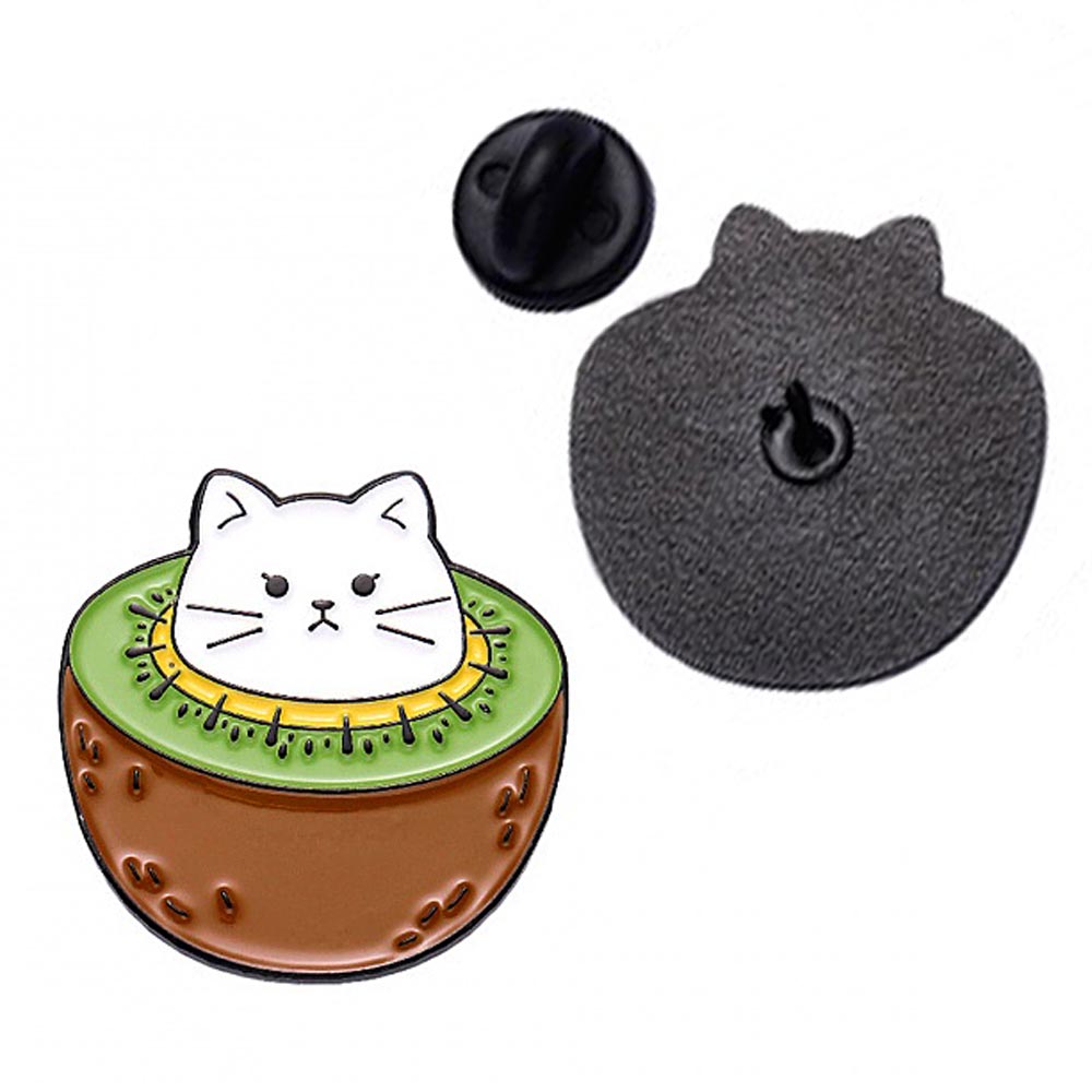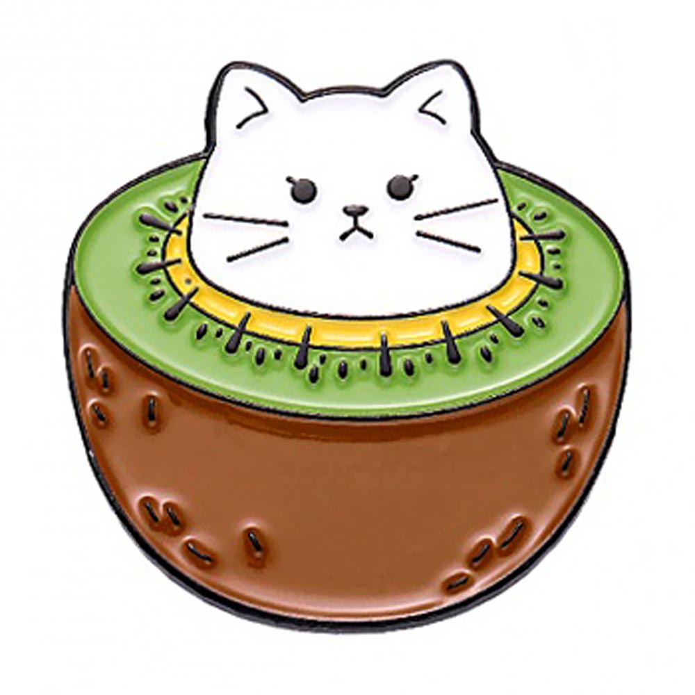 Брошь-значок металлическая Котик в киви коричневая, белая и зеленая эмаль TOV-0453 основа черного цвета с клипсой 25х25 мм