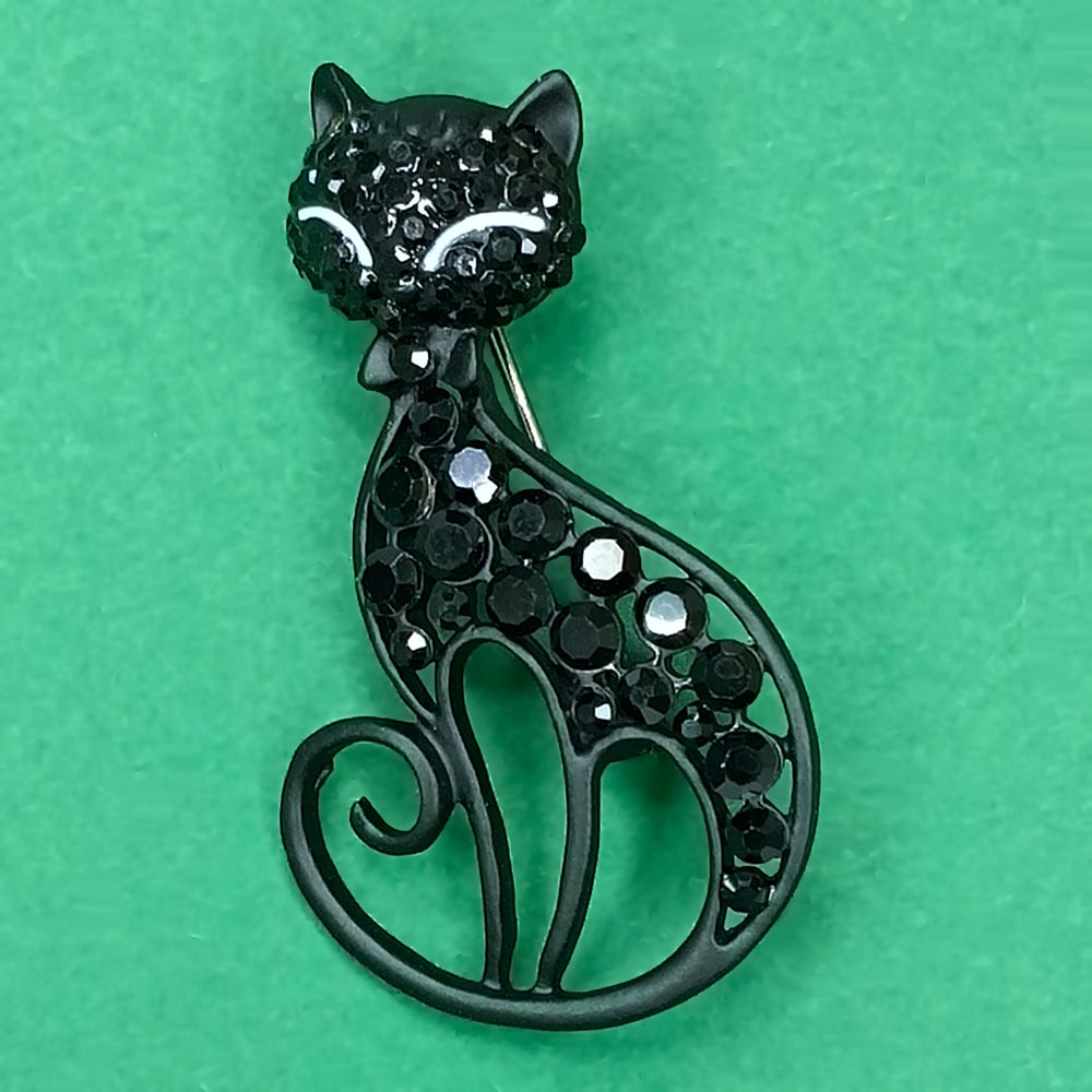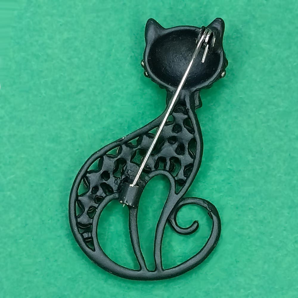 Брошь металлическая Кошка прозрачная с черными стразами TOV-0458 основа черного цвета 47х28х13 мм