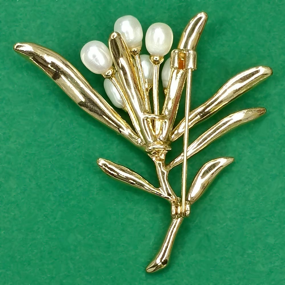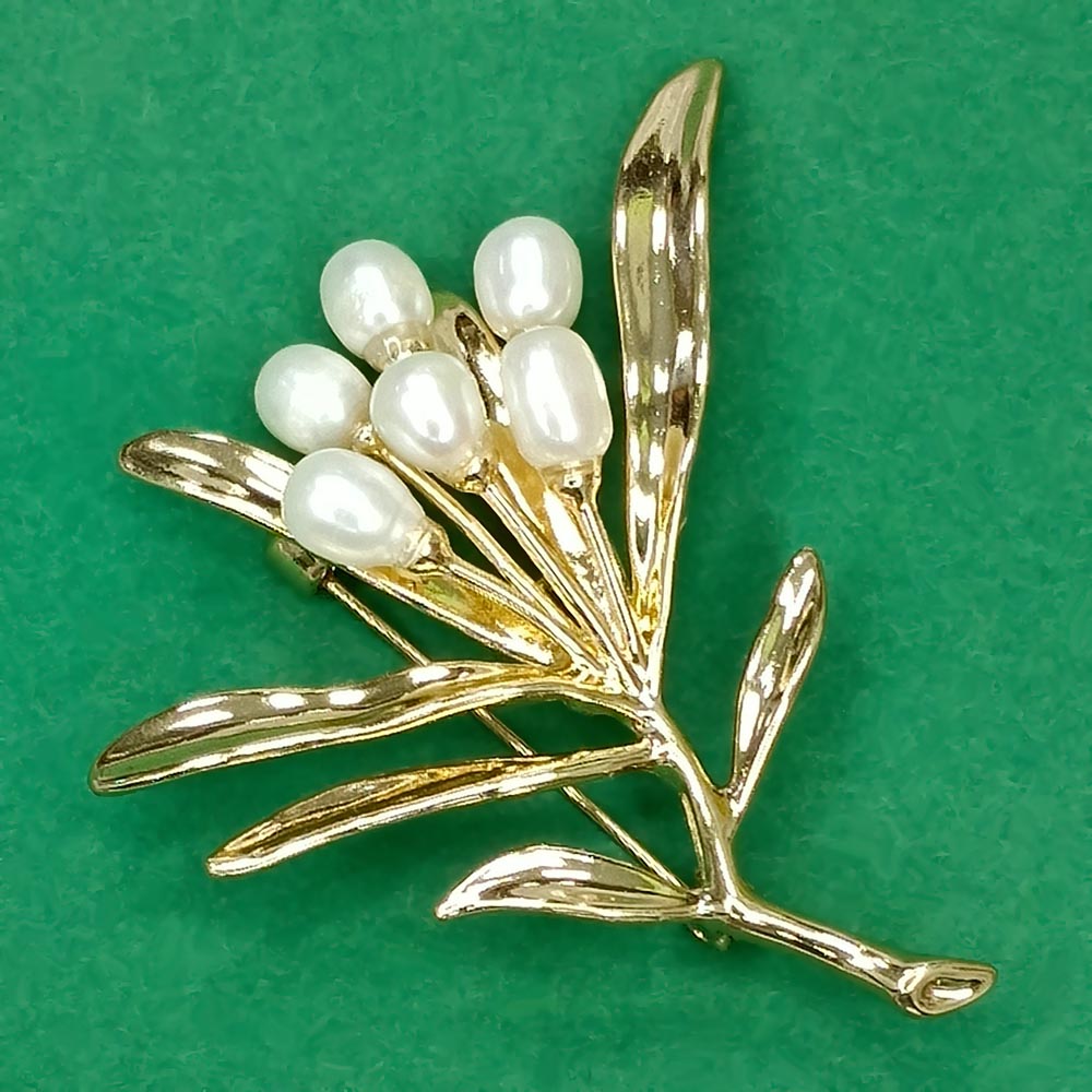 Брошь металлическая Ветка с бусинами под жемчуг TOV-0460 основа золотого цвета 50х50х13 мм
