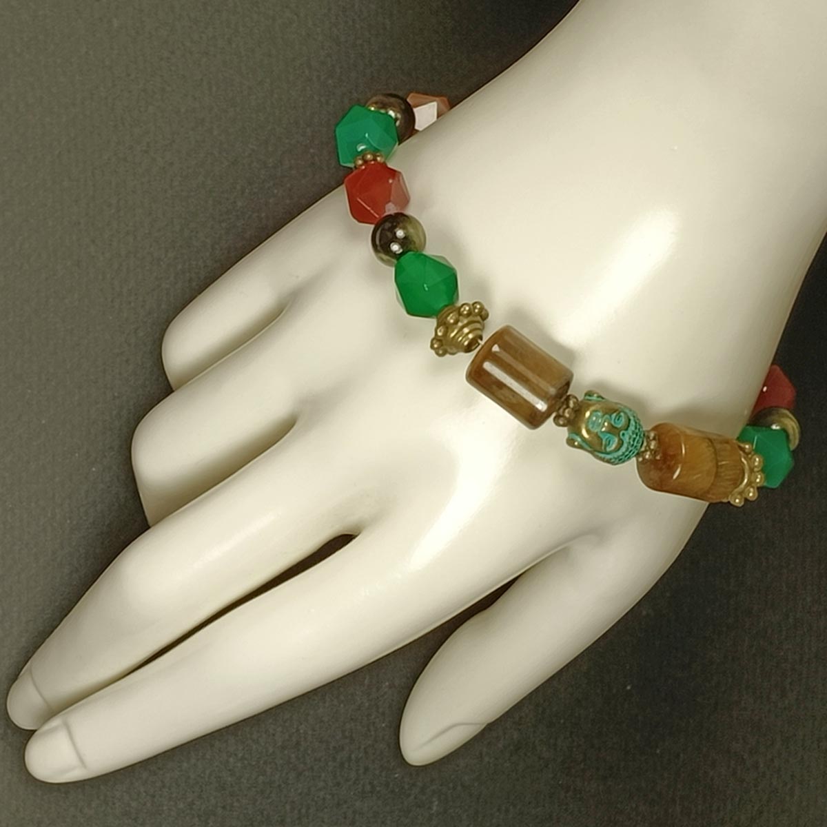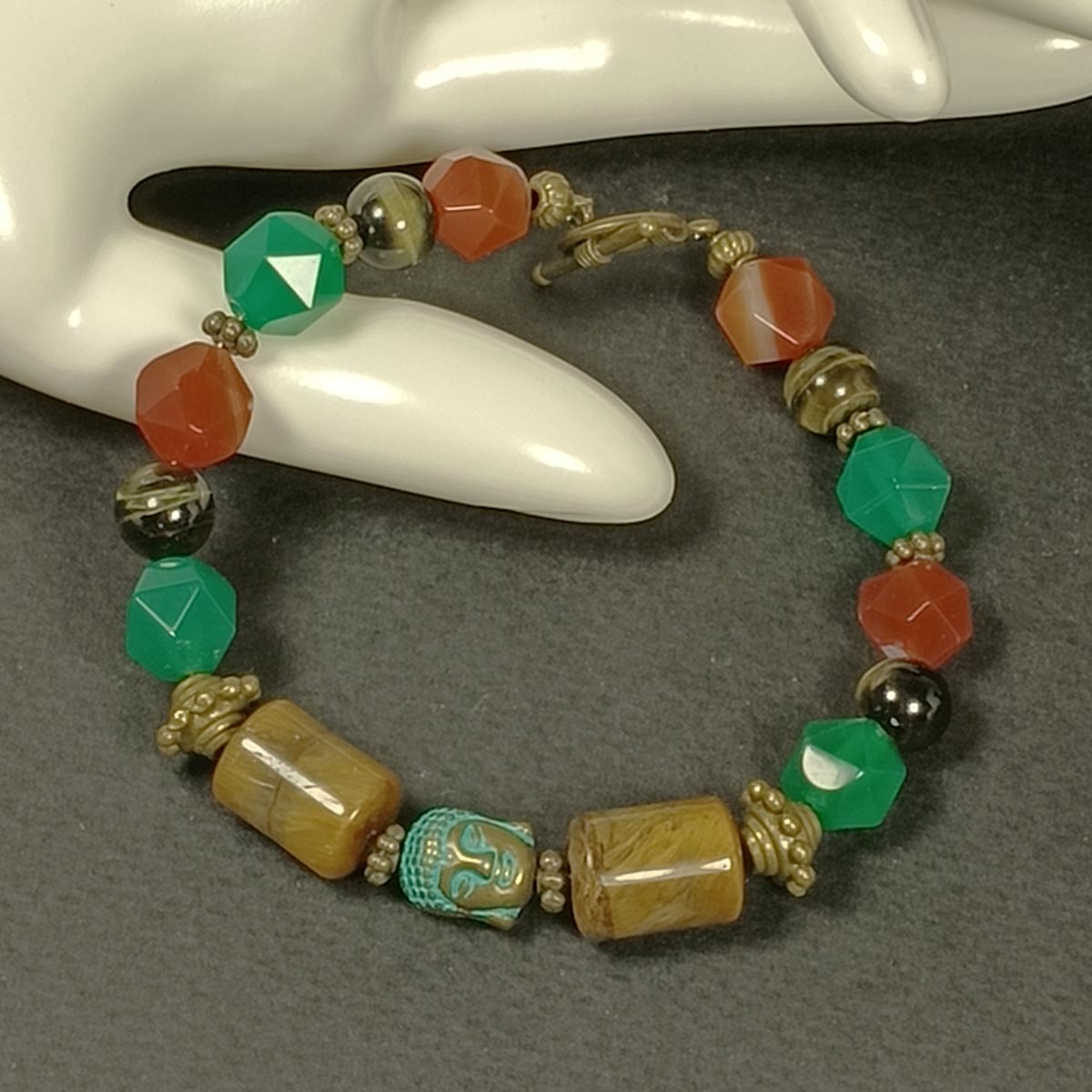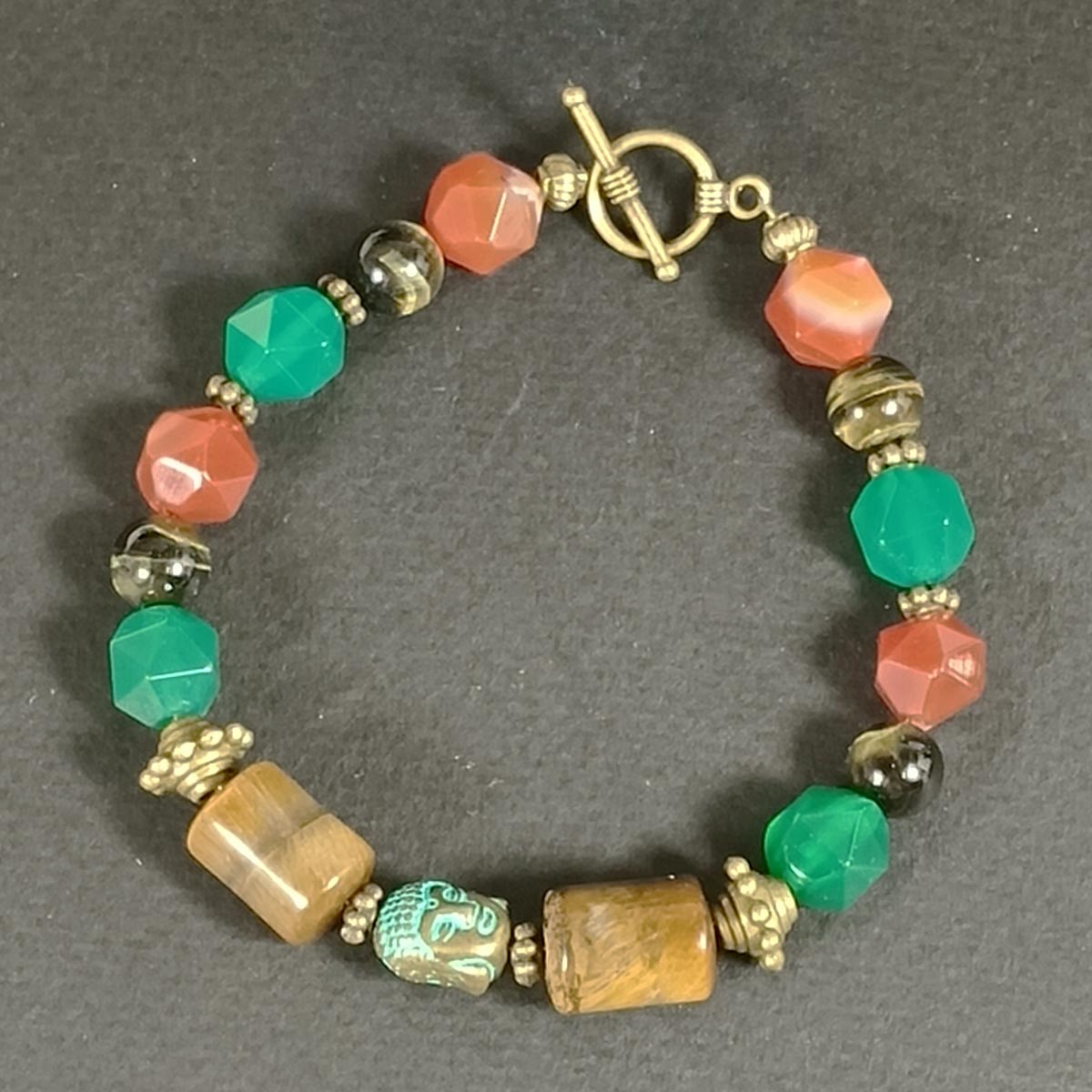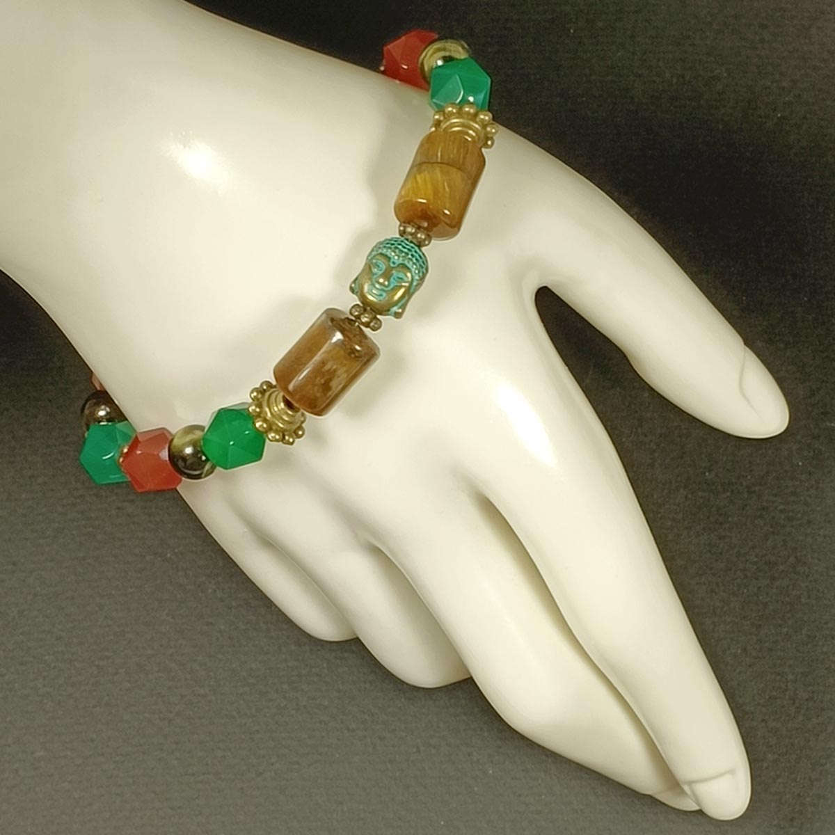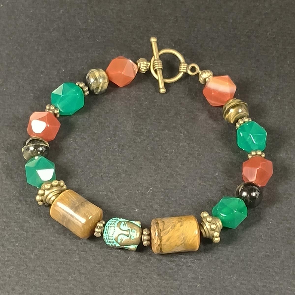 Браслет из натуральных камней (нефрит, сердолик, тигровый и соколиный глаз) TOV-0525 ручная работа, длина 21 см, диаметр 6 см