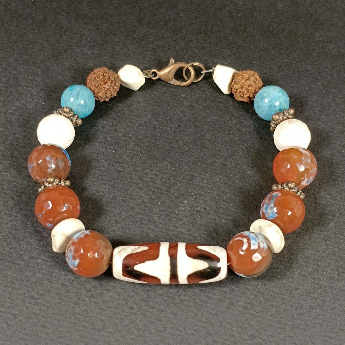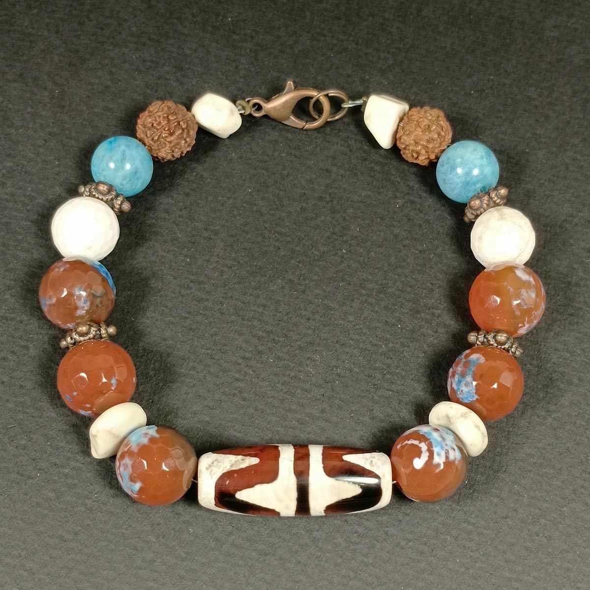 Браслет из натуральных камней (агат, дзи зуб тигра, аквамарин, рудракша) TOV-0534 ручная работа, длина 22.5 см, диаметр 6.5 см