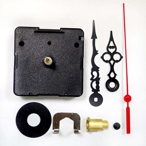 Комплект: механизм шток 21 мм, стрелки (часовая 47 мм, минутная 70 мм от центра, секундная), гайка с шайбой и прокладкой, крепежная петля